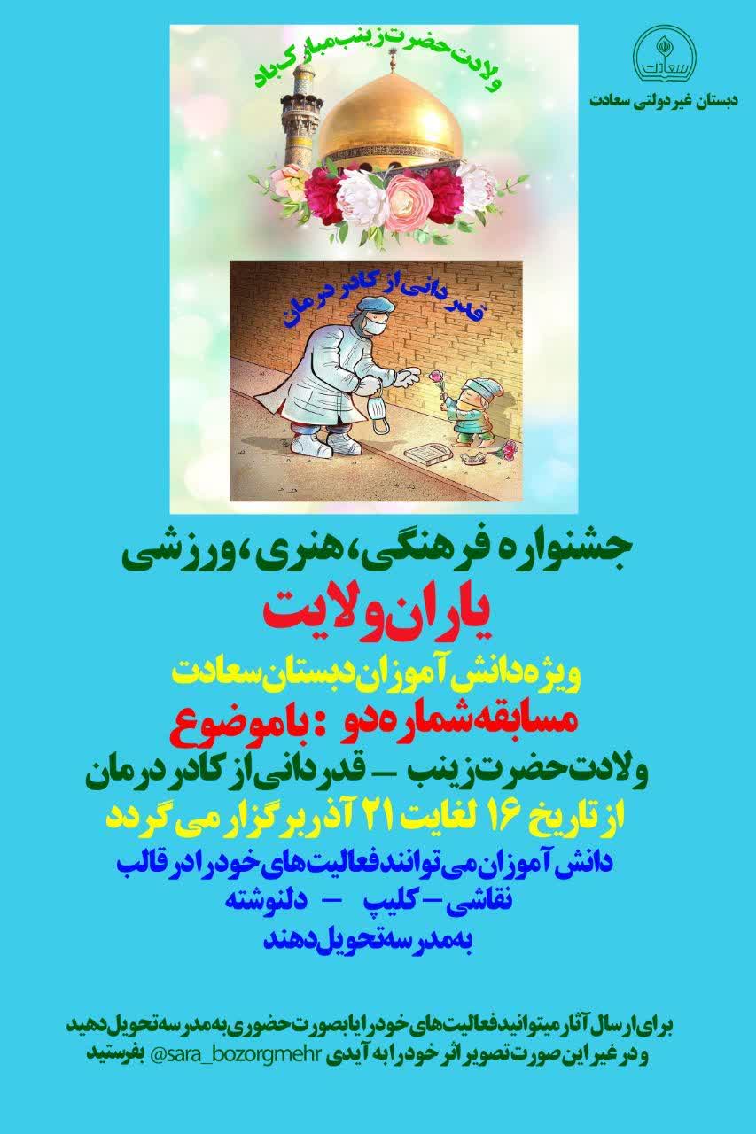 همزمان با فرا رسیدن ایام ولادت حضرت زینب (س) مراسم جشن در نمازخانه دبستان برگزار گردید در این مراسم که به صورت حضوری با جمعیت محدود و با فاصله گذاری اجتماعی برگزار گردید دانش آموزان بذرافشان،لشگری،ناصربخت،جمشیدیان،به اجرای برنامه قرائت قرآن ،دکلمه خوانی،مولودی خوانی و پانتومیم پرداختند همچنین مدیریت محترم دبستان در سخنانی بر جایگاه رفیع حضرت زینب (س) و تجلیل از کادر درمان پرداختند.